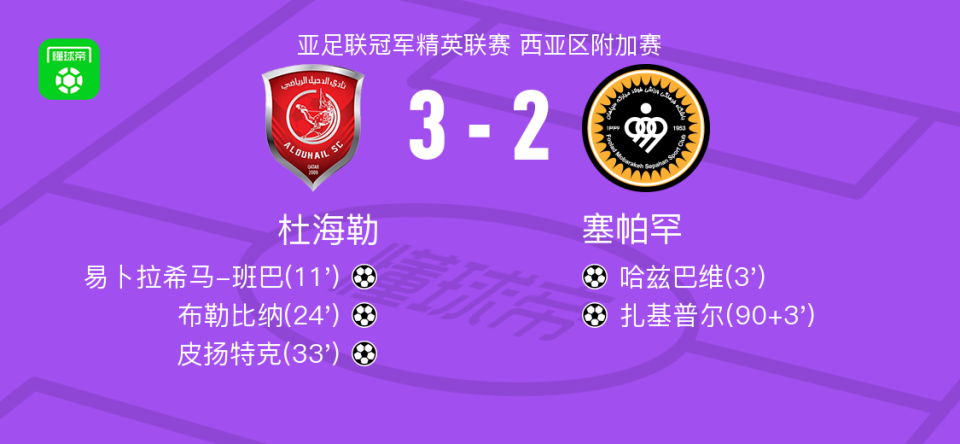 北京时间8月13日,亚足联冠军精英联赛西亚区附加赛展开较量,杜海勒与塞帕罕展开激烈对决。比赛第3分钟,塞帕罕球员哈兹巴维率先进球。第11分钟,布里若送出助攻,易卜拉希马-班巴为杜海勒扳平比分。第24分钟,图塔传中精准找到布勒比纳,后者破门帮助球队反超。第33分钟,皮扬特克再下一城,将比分扩大至3比1。下半场补时阶段,塞帕罕由扎基普尔再追一球,但未能扭转局势。最终,杜海勒以3比2战胜塞帕罕。